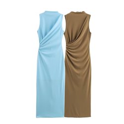 Mujeres 2025 primavera nueva moda plisado Midi vestido Retro sin mangas Casual Chic Mujer Vestidos robe Mujer