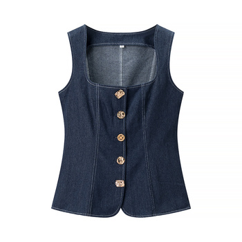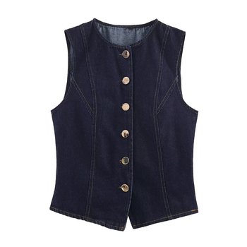 Mujeres 2025 otoño nueva moda Denim Slim-Fit chaleco abrigo Vintage cuello redondo abotonado sin mangas Casual mujer chaleco Chic Tops