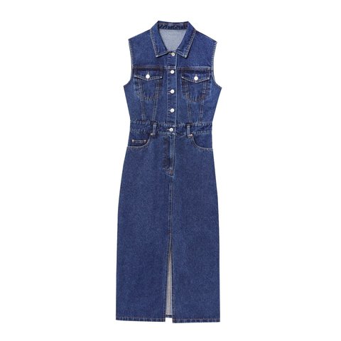 Mujeres 2025 primavera nueva moda elegante Denim vestido largo Vintage sin mangas bolsillos Casual Mujer Vestidos bata Mujer