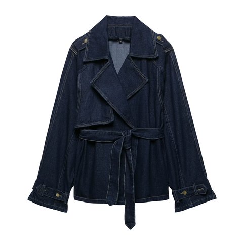 Mujeres 2025 primavera nueva moda elegante cinturón corto ancho diseño Denim gabardina Vintage manga larga Casual mujer prendas de vestir exteriores Tops